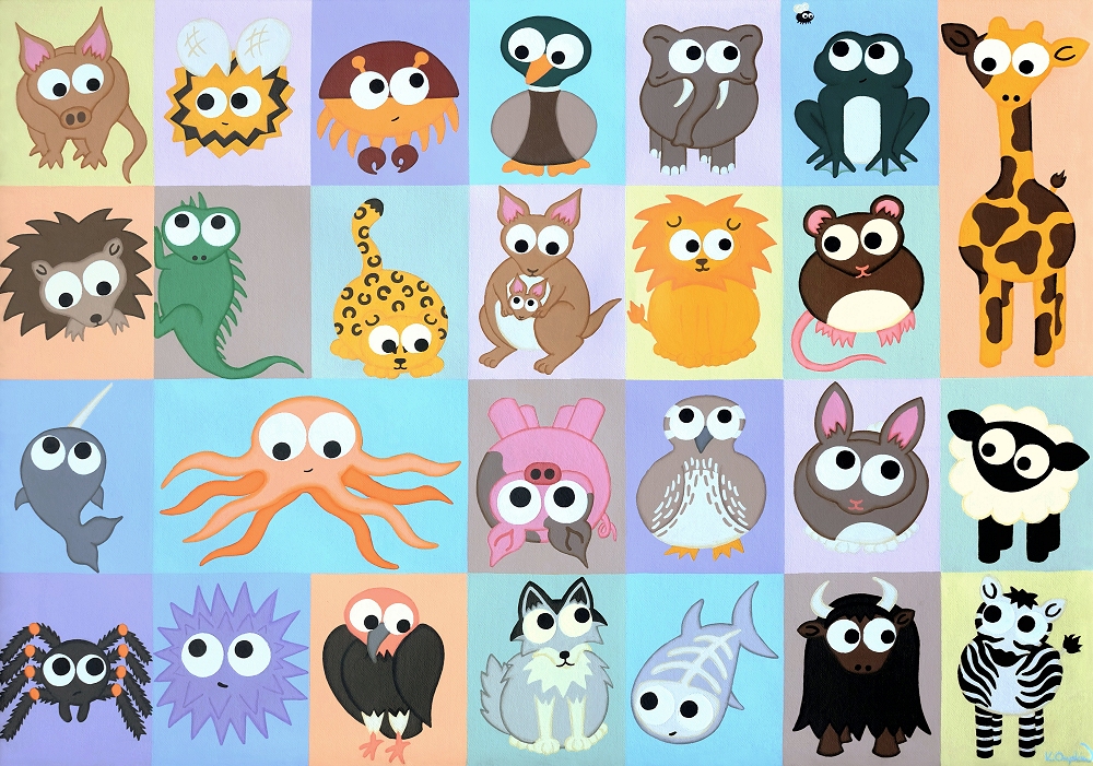 Growing up surrounded by the Yorkshire countryside and with a house constantly full of animals has had a large impact on Kim's paintings. The natural world is often the focus in her work, whether it's scenic landscapes with vivid skies or the whimsical side of animals in her cartoon style pieces.